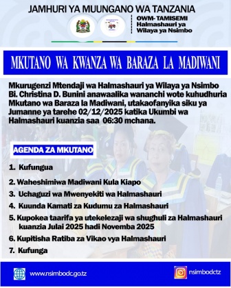 Mkurugenzi Mtendaji wa Halmashauri ya Wilaya ya Nsimbo Bi. Christina Daniel Bunini amewaalika wananchi wote kuhudhuria ili kushuhudia matukio mbalimbali yatakayofanyika katika mkutano wa kwanza wa Baraza la Madiwani utakaofanyika siku ya Jumanne ya Disemba 2, 2025 katika ukumbi wa Halmashauri hiyo kuanzia saa 06:30 mchana.